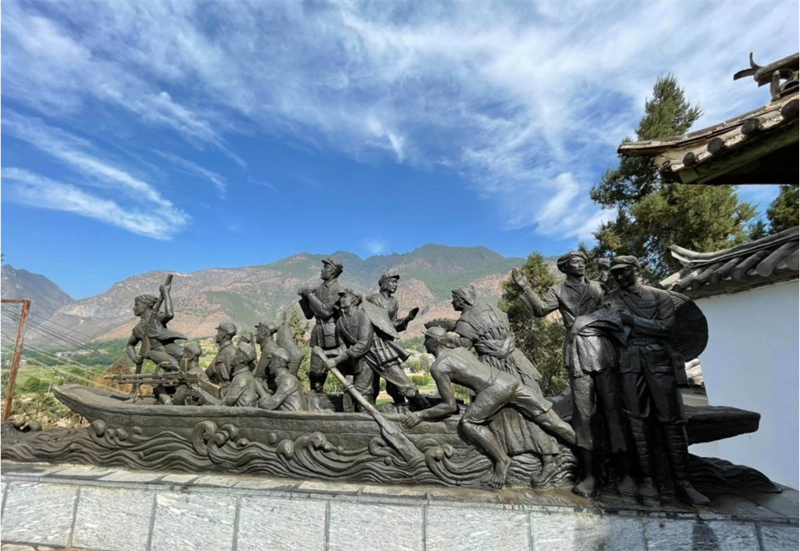 1936年4月25日黄昏,红二、六军团渡江先锋团——四师十二团,由团长黄新廷带领十几名战士,于木瓜寨驾起在海洛塘搞到的小船首渡成功,接着,大队人马点燃火炬开始夜渡。渡过江的红军在沿岸继续找船,总共得到七条船,二十八名水手,还请木匠扎了一些筏子,于是,在东起石鼓西至巨甸的一百多里江面上,二、六军团全面展开了渡江作业。经过四天三夜不停地摆渡,到28日晨,二、六军团一万八千人全部渡过金沙江,将敌人远远甩在了身后。